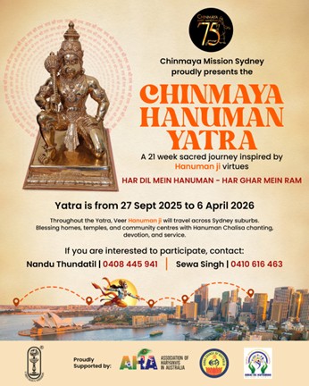 Beginning at Chinmaya Sannidhi ashram in Castle Hill on 27 Sept 2025 and culminating at the Chinmaya Hanuman Festival, Blacktown Showgrounds Oval on 6 April 2026, the Hanuman Yatra will journey through the heart of Sydney suburbs — awakening souls, uniting communities with devotion & service – the Hanuman Way, and celebrating the timeless relevance of Pujya Gurudev Swami Chinmayananda’s vision.